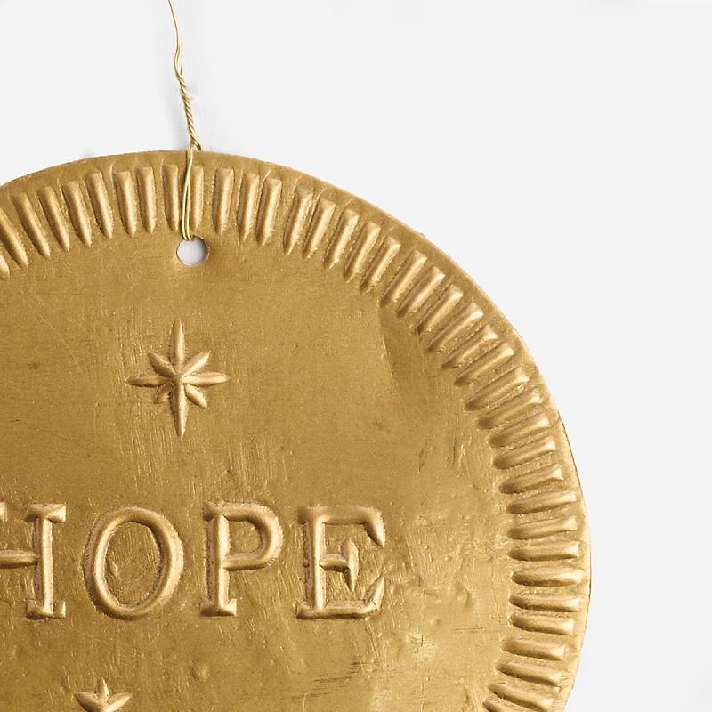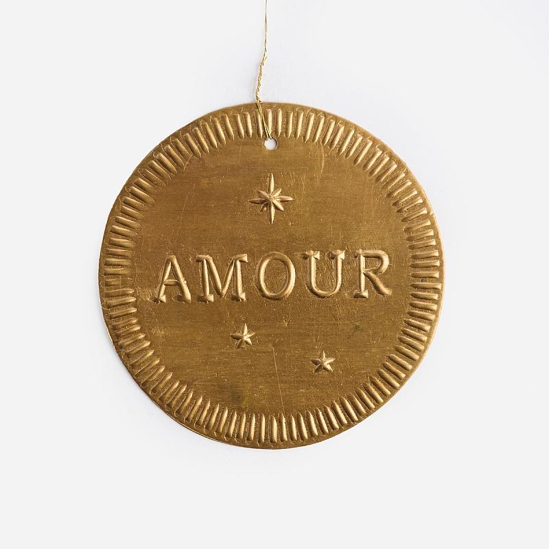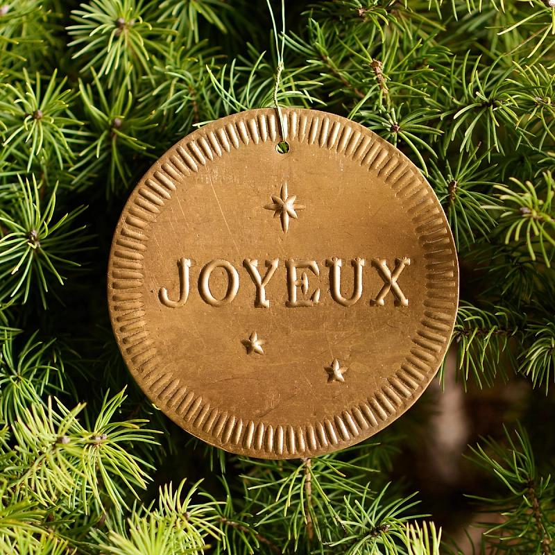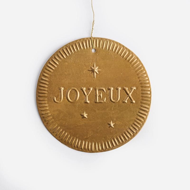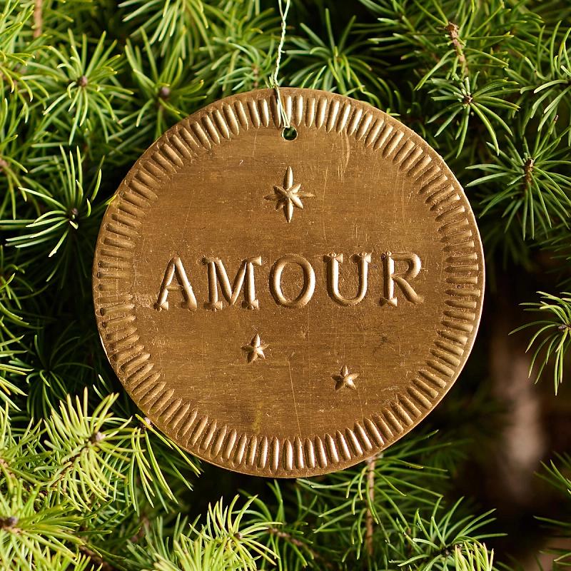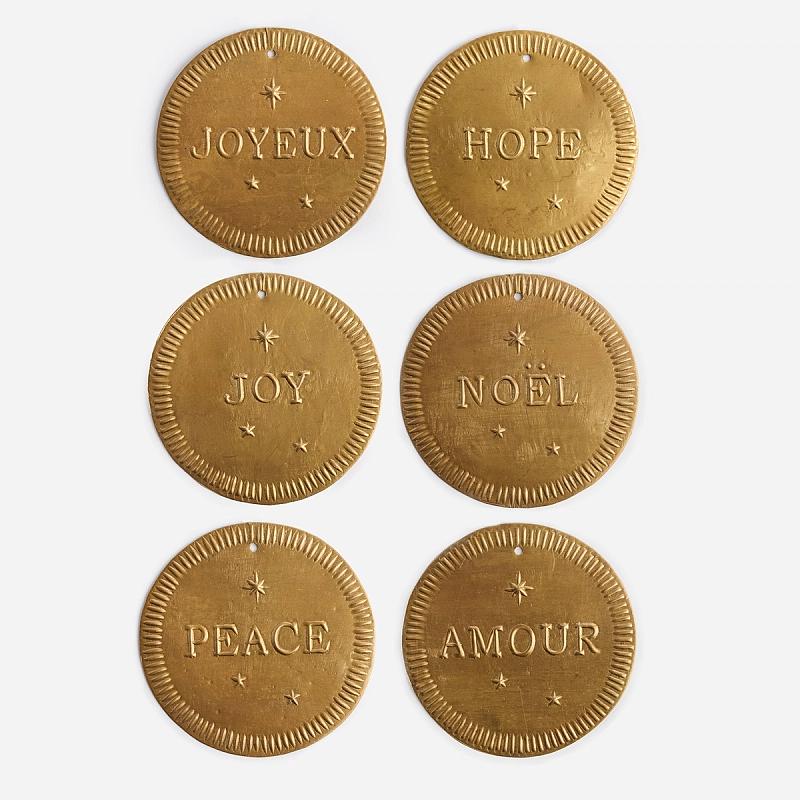 The Antiquity Basilica Set features six hand-pressed solid brass discs, each hand-rubbed to create a warm, aged patina. Suspended on fine brass wire, the disks display a combination of six French and English words, adding a charming, international touch to your holiday décor. Perfect for hanging on a Christmas tree or as a beautiful finishing detail on gift wrapping, this set is modelled on a recent find from the Paris flea market, bringing authentic old-world elegance to your festive celebrations.