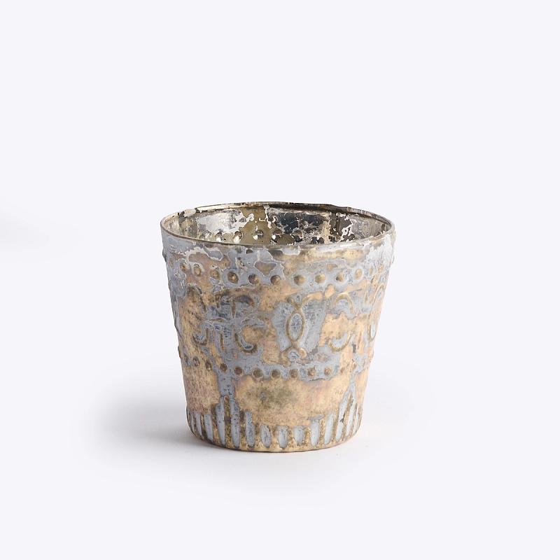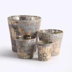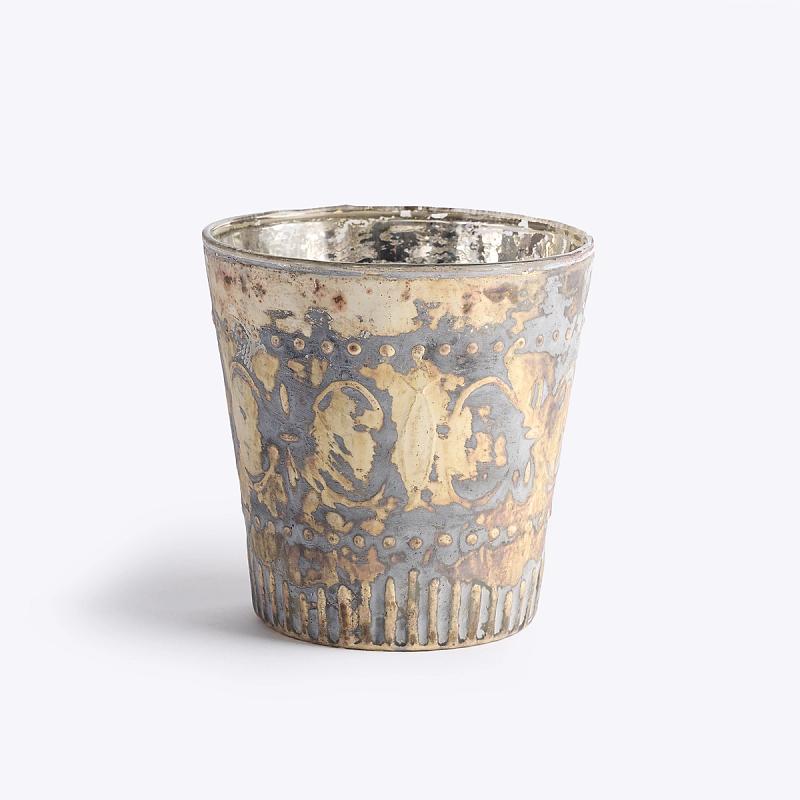 Graceful and refined, the Handel collection features a distinctive conical form and a subtle fleur-de-lys motif that evokes timeless European style. Each piece is individually handcrafted using traditional mercury silvering techniques, resulting in a beautifully worn finish and authentic aged patina. With gentle variations and imperfections that make every votive unique, the Handel collection casts a soft, romantic glow—bringing warmth and elegance to any setting. Combine with candle votives or flameless battery tea lights (not included). Available in three sizes.
