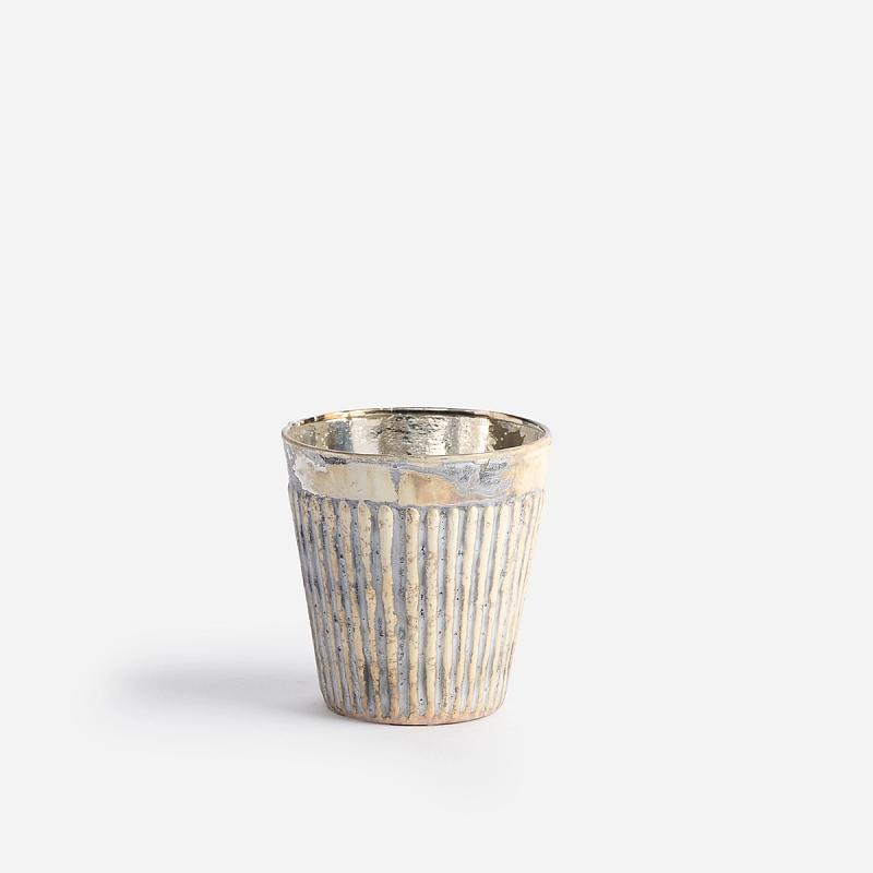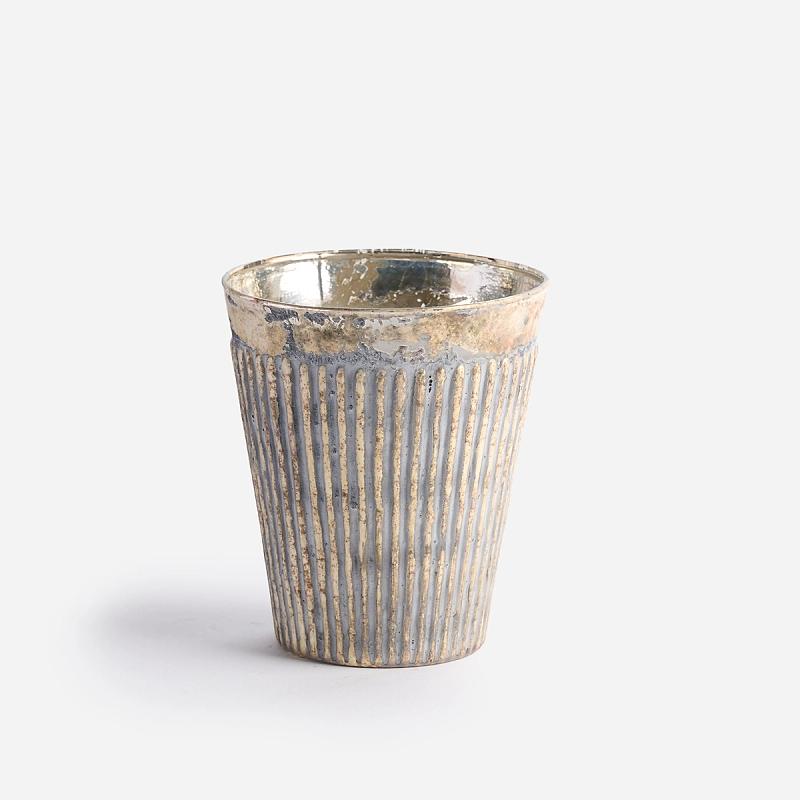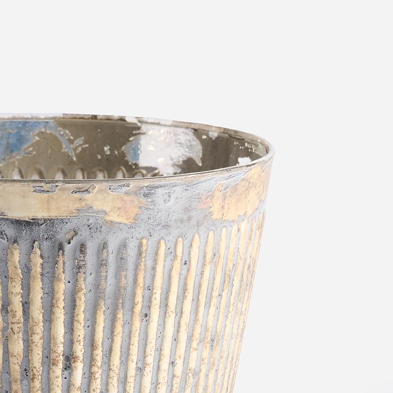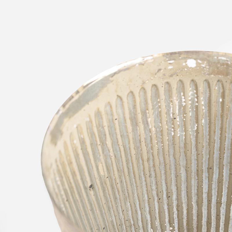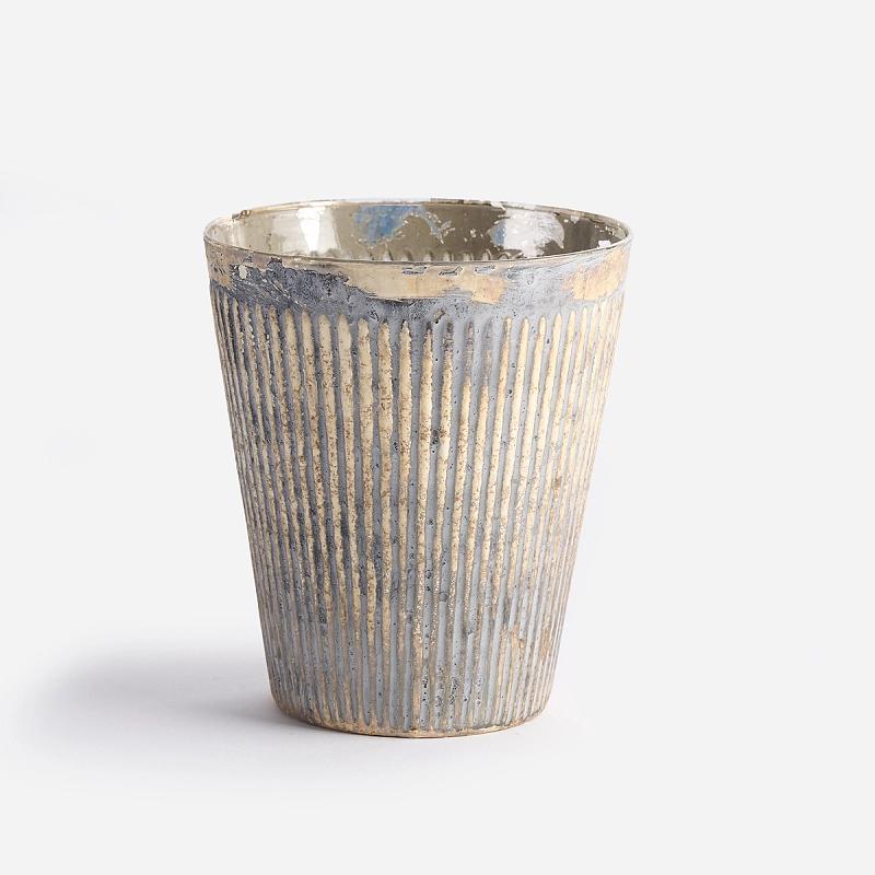 The Wagner collection features a gentle conical shape adorned with long, elegant lines of embossed gold, creating a striking yet refined design. Handcrafted using traditional mercury silvering techniques, each votive showcases subtle variations and an authentic aged patina, making every piece unique. Available in three sizes, the Wagner collection casts a warm, inviting glow, adding sophistication and charm to any setting. Mix and match for dramatic impact. Combine with candle votives or flameless battery tea lights (not included).